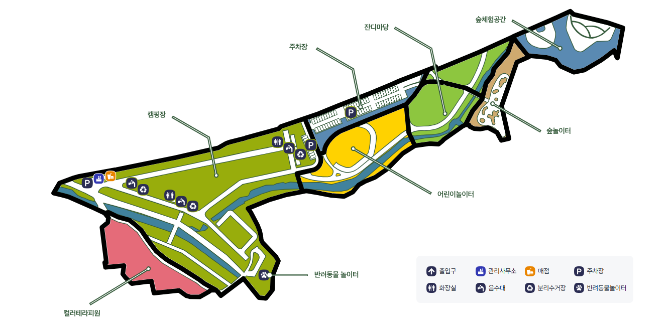 - 잔디마당, 숲 놀이터, 숲 체험공간, 컬러테라피원, 반려견 놀이터 등 다양한 부대시설