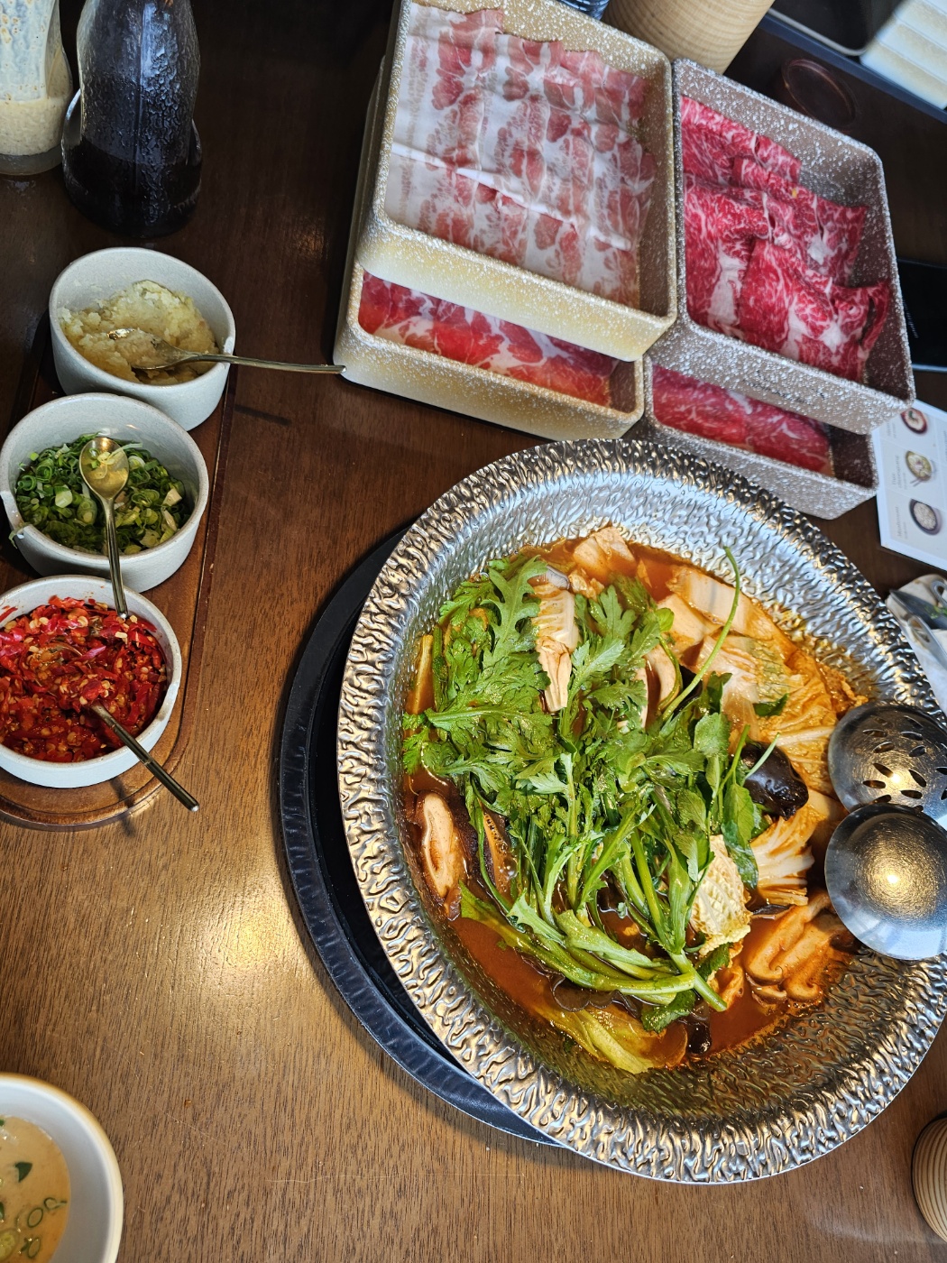 소스는 특제 참깨소스와 간장소스 두 가지가 기본으로 제공되었는데, 저는 참깨소스에 다진 마늘과 청양고추를 듬뿍 넣어 고소하면서도 매콤한 맛을 내어 먹었어요. 한우 윗등심은 참깨소스와, 목살은 간장소스와 궁합이 정말 좋았답니다! 👍