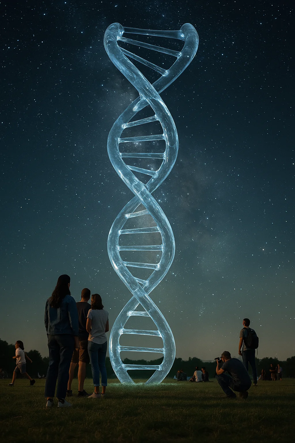 대한 투명 DNA 구조물이 은은한 빛 속에 밤하늘 아래 떠 있고, 그 아래 다양한 사람들